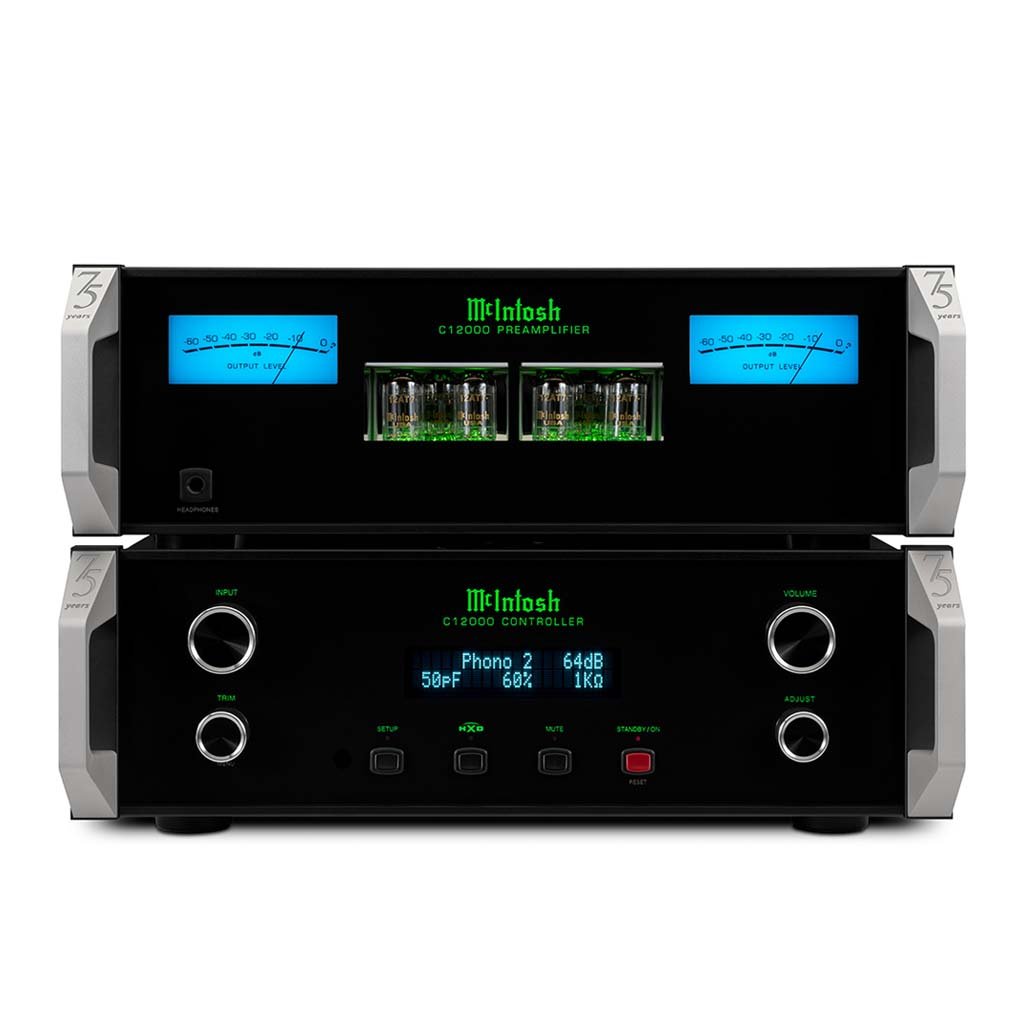 With classic McIntosh black glass front panels, blue meters, knobs, stainless steel chassis, illuminated logos, and custom machined brushed aluminum handles, the C12000 makes a visual statement in addition to its audio prowess. It can be paired with a variety of McIntosh amplifiers, speakers, room correction devices, CD players, turntables, tuners, media streamers and other source components to make a complete home audio system.
