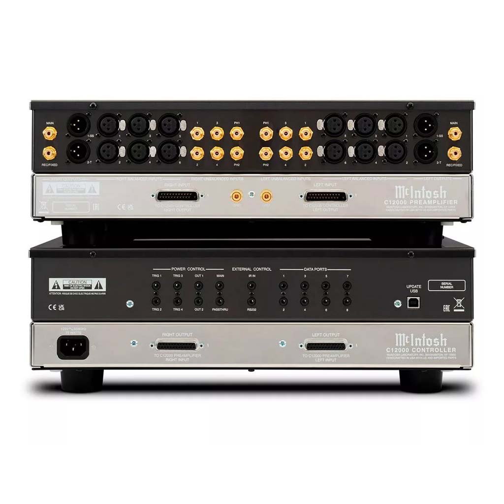 The McIntosh C12000 is a flagship 2-channel preamplifier distinguished by its two-chassis design, separating the control/digital from the analog audio for ultimate purity. Uniquely, it offers selectable solid-state or vacuum tube (4x 12AX7A) output stages, allowing sonic tailoring.
