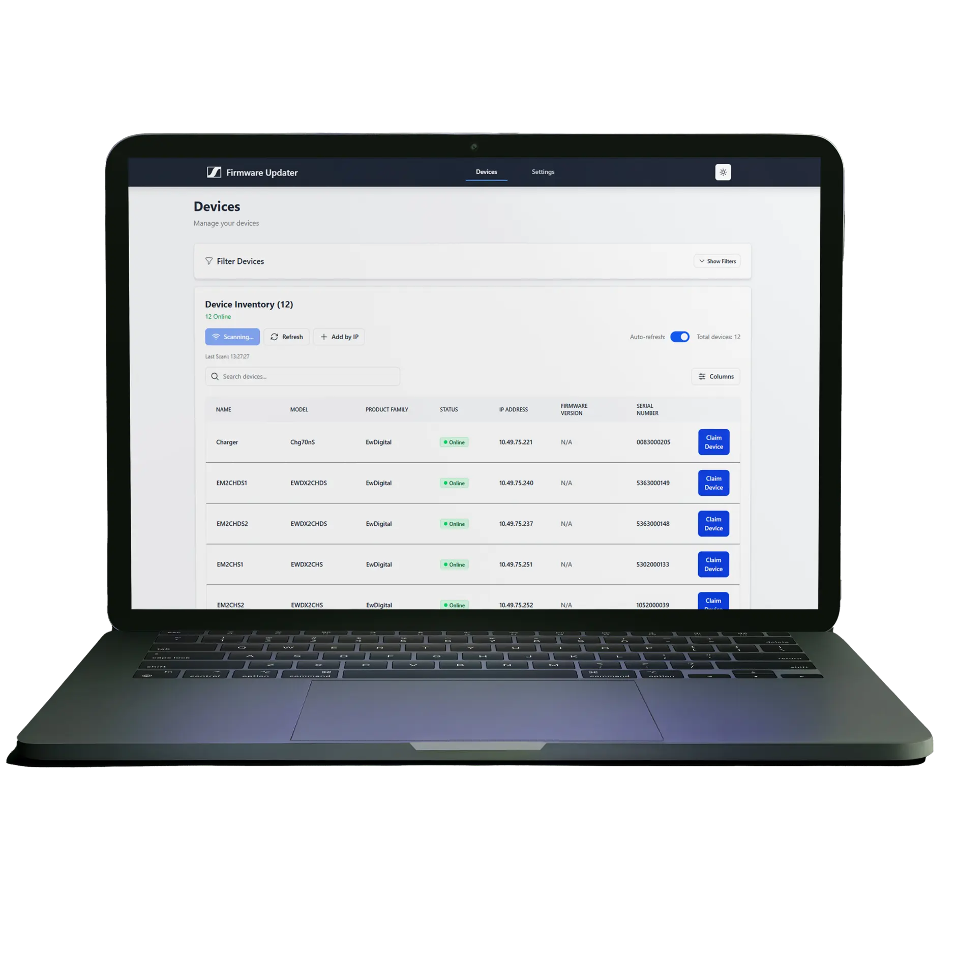 Firmware Updater is a comprehensive device management solution designed for audio professionals who need efficient, reliable equipment management. Discover, manage, and update your EW-DX audio devices from a single, intuitive interface. Core Functionality Update Device Firmware – Keep your equipment current with one-click firmware updates, complete with progress tracking and automatic verification. Claim Devices – Securely add devices to your managed inventory with password protection and encrypted communication. Password Management – Quickly change device passwords with real-time validation and secure transmission. Factory Reset – Perform fast, reliable factory resets for device preparation and maintenance workflows.