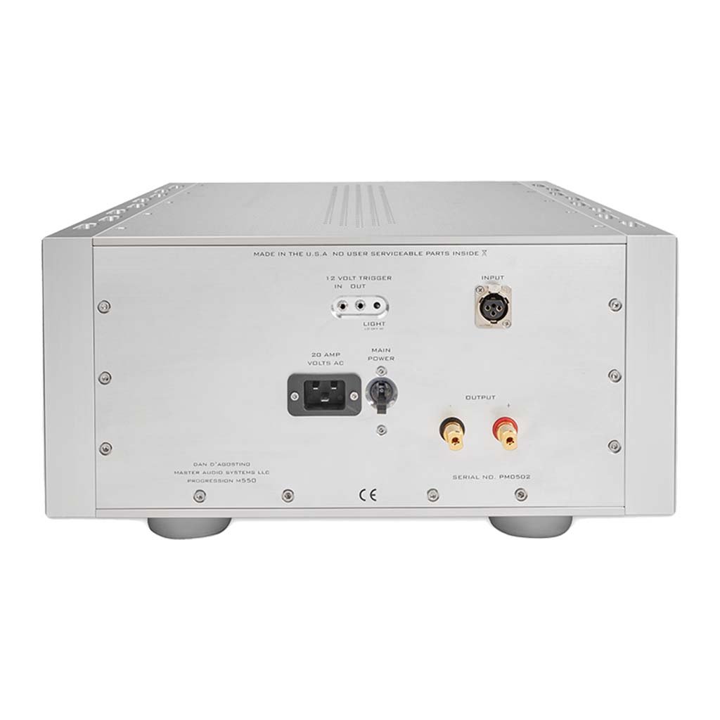 With innovative circuitry and virtually unlimited power output, the Progression M550 Mono Amplifiers deliver intimate musical details, three-dimensional sound staging, and startling dynamics not possible from less capable designs.