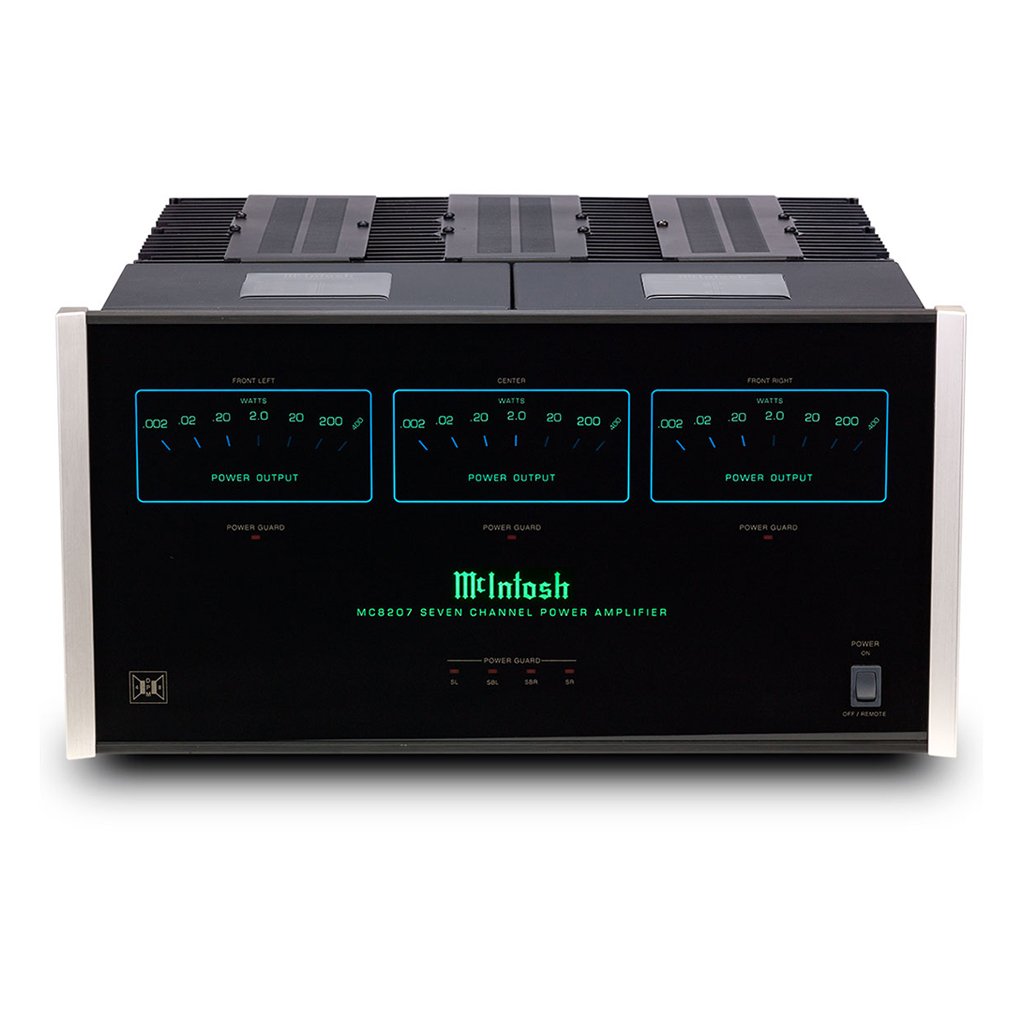 The McIntosh MC8207 is a powerful 7-channel solid-state amplifier delivering 200 Watts per channel into 4 or 8 Ohms, ideal for high-performance home theater systems. Its fan-less design ensures silent operation crucial for immersive viewing.